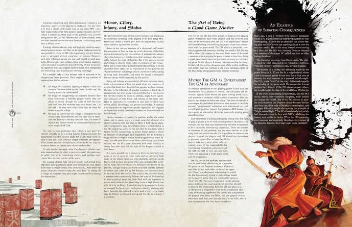 Yes, there's a nice framing device, but the actual page layout is still "two-column-walls-of-text", and I can only imagine that every second or third page opening has a quarter-page illustration on it (maybe a half page if we're lucky). I didn't specifically go looking for fancy pages, and this was just one of the many examples that came up in my search, so don't crucify me for attacking the game this is from, I'm just considering layout at the moment.